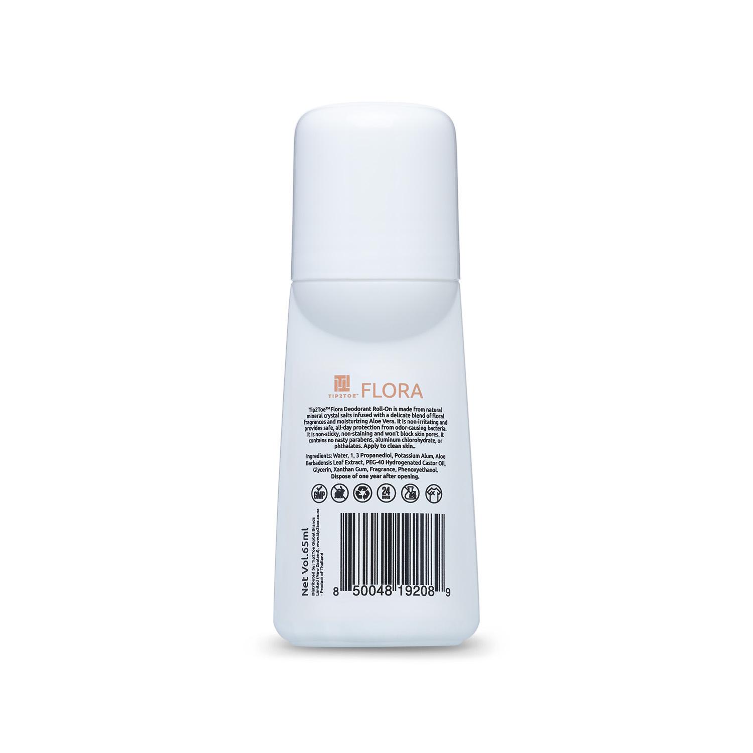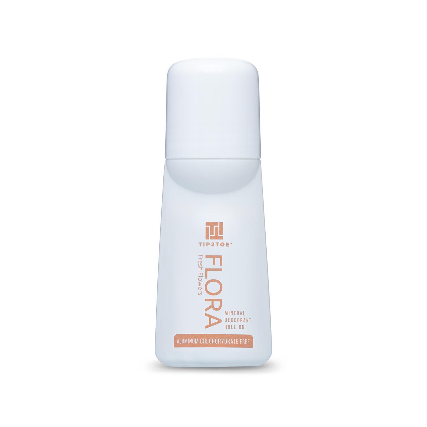 Tip2ToeTM Flora Deodorant Roll-On is made from natural mineral crystal salts infused with a delicate blend of floral fragrances and moisturizing Aloe Vera. It is hypoallergenic and provides safe, all-day protection from odor-causing bacteria. It is non-sticky, non-staining and won’t block skin pores. It contains no nasty parabens, aluminum chlorohydrate, or phthalates.